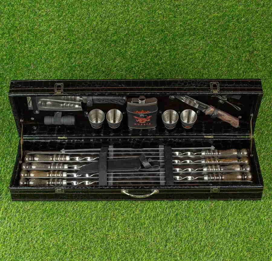 Набор для шашлыка в подарочном кейсе позволит Вам держать все аксессуары настоящего любителя жареного мяса,
