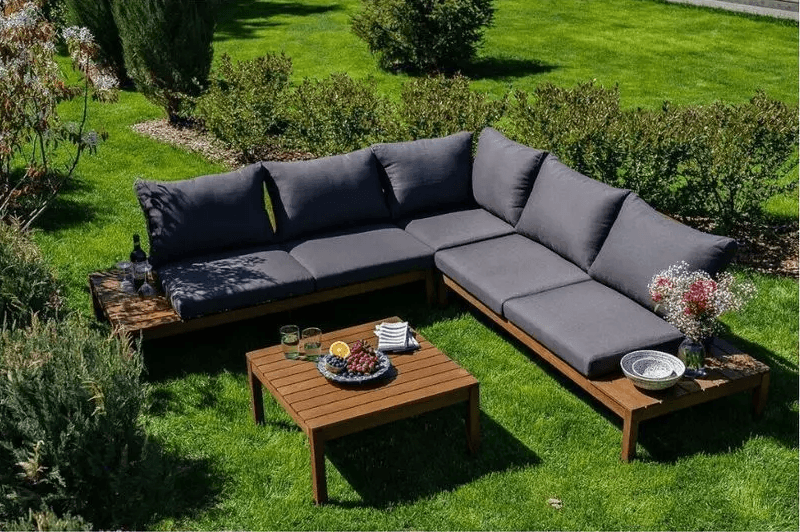 Отличный современный стильный вариант уличной лаунж зоны. Темно-серые подушки приятной фактуры в комбинации